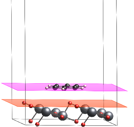 Figure 1. Interaction between Benzene molecule and Titanium Dioxide surface [110], the purple plane indicates the benzene surface and red one indicates the TiO2 surface. Builded on it on Virtual NanoLab.