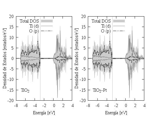 # Canvas size and initial position variables #=========================================== xsize= 0.40 # Plot width in relation with canvas ysize= 0.90 # Plot height in relation with canvas xinit= 0.10 # The starting possition of the first plot # Settings of multiplot and global properties #============================================ # What appears in this section will be repeated in each plot set multiplot layout 1,2 columnfirst title "" # 1 row with 2 columns set xlabel "Energy [eV]" set ylabel "Density of States [states/eV]" set key at 0.3, 19 nobox # Location of the label box set xr [-8:4] # x ranges of both plots set yr [-20:20] # y ranges of both plots # First plot #======================================= # Reset keys unset rmargin unset lmargin # Set individual keys set size xsize, ysize # Plot size in relation with canvas set lmargin at screen xinit # x inital possition 0.10 set rmargin at screen xinit + xsize # x final possition 0.50 set label TiO_{2}" at -7, -15 set xlabel "Energy [eV]" offset 14,0 # Displace xlabel to the center of canvas set ylabel "Density of States [states/eV]" plot "DOS0.dat" using 1:2 title "Total DOS" with lines ls 5 , \ "DOS0.dat" using 1:3 title "" with lines ls 5, \ "ti_dos.dat" using 1:6 title "Ti (d)" with lines ls 10, \ "ti_dos.dat" using 1:7 title "" with lines ls 10, \ "o_dos.dat" using 1:4 title "O (p)" with lines ls 11, \ "o_dos.dat" using 1:5 title "" with lines ls 11; # Second plot #======================================= # Reset keys unset rmargin # Clears the past x possition unset lmargin unset label # Clears the past label unset ytics # Removes the y axis tics unset ylabel # Removes the y axis label # Set individual keys set size xsize, ysize # Plot size in relation with canvas set lmargin at screen xinit+xsize # x inital possition 0.50 set rmargin at screen 1 - xinit # x final possition 0.90 set label TiO_{2}_Pd" at -7, -15 # TRICK Displace x axis label outside the canvas # but maintains the label space to be align set xlabel "Energy [eV]" offset 50,0 plot "DOS0.dat" using 1:2 title "Total DOS" with lines ls 5 , \ "DOS0.dat" using 1:3 title "" with lines ls 5, \ "ti_dos.dat" using 1:6 title "Ti (d)" with lines ls 10, \ "ti_dos.dat" using 1:7 title "" with lines ls 10, \ "o_dos.dat" using 1:4 title "O (p)" with lines ls 11, \ "o_dos.dat" using 1:5 title "" with lines ls 11;
