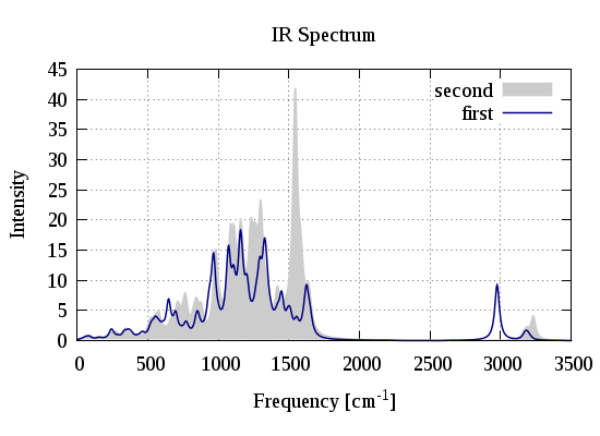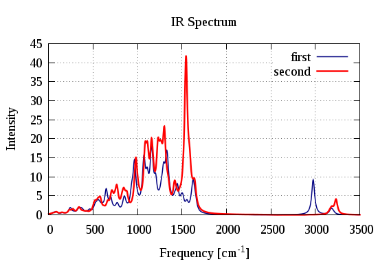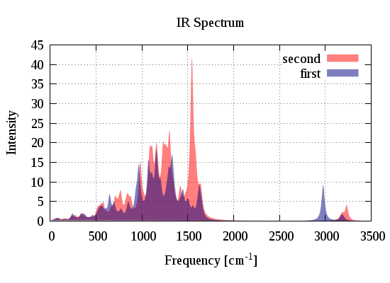 plot "first_ir.dat" using 1:2 title 'first' with lines ls 5, \      "second_ir.dat" using 1:2 title 'second' with lines ls 11;